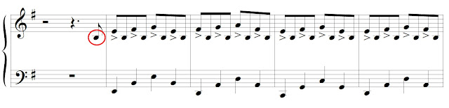 The red ring highlights the B that I repeat and alternate to the melodic notes (with the accent >).